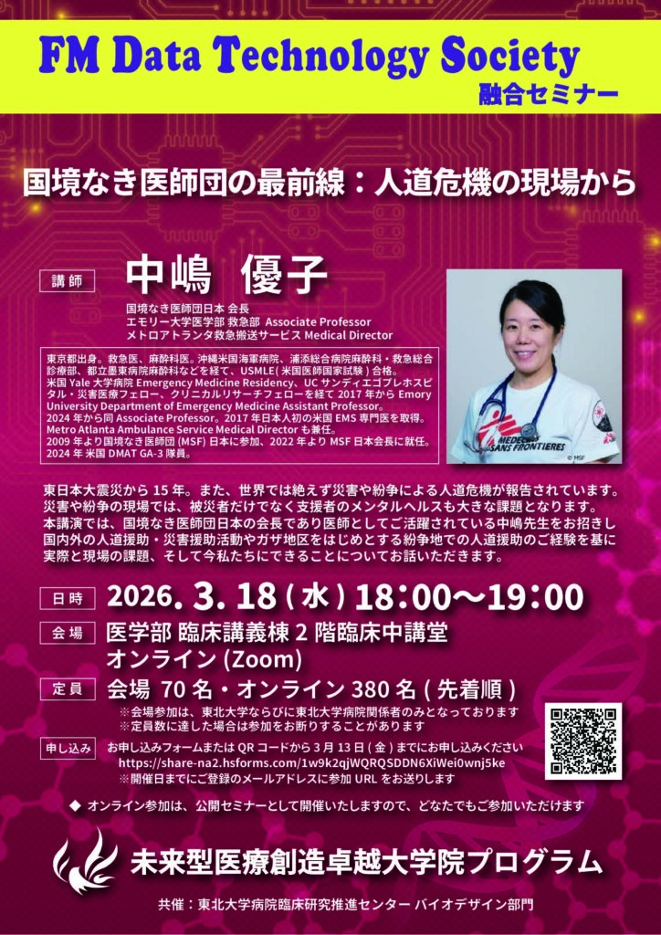 下記ならびに添付の通り、未来型医療創造卓越大学院プログラム FM DTS融合セミナーについてご案内いたします。