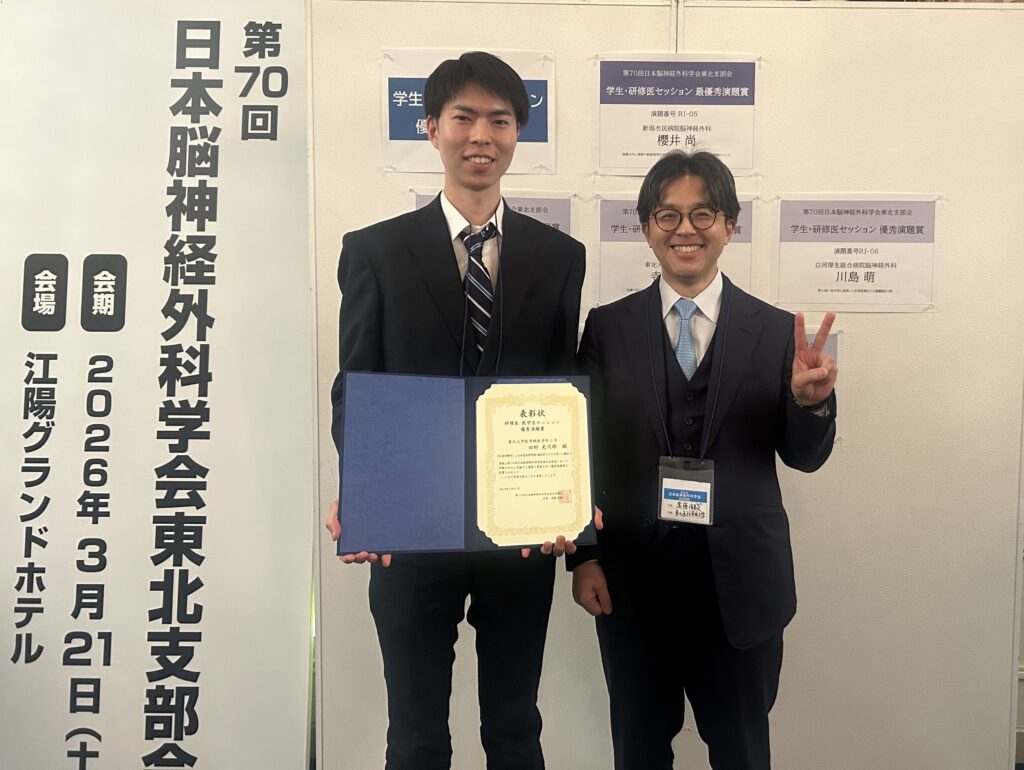 脳神経外科からも若手を中心に多数の演題発表を行いました。その中で、本学会で企画された研修医・学生セッションにおいては、基礎修練を脳神経外科でされた東北大学医学部3年生の田村光司郎さんが優秀演題賞に選出され、表彰されました。